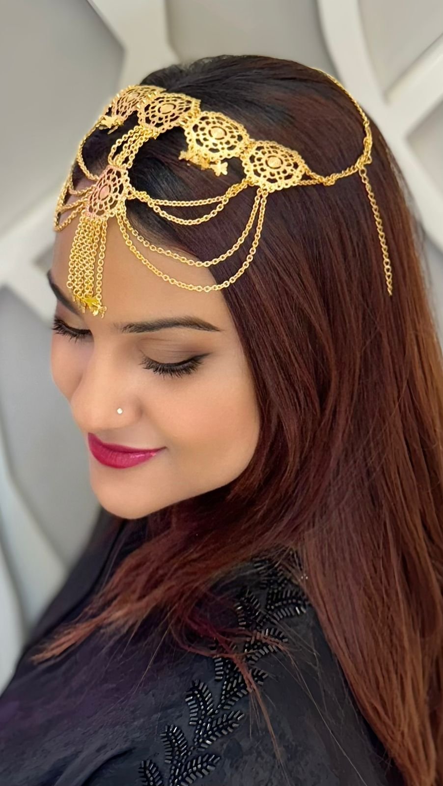 This is a beautiful necklace/Headpiece is elegant accessory that can be styled as both a headpiece (worn on the head) and a necklace (worn around the neck). It typically features a design that allows easy transformation between the two forms, making it perfect for weddings, festivals, or special occasions, this multifunctional piece adds a touch of luxury to any outfit.