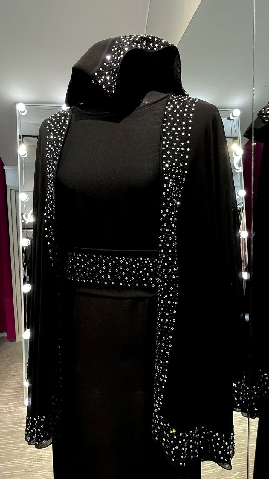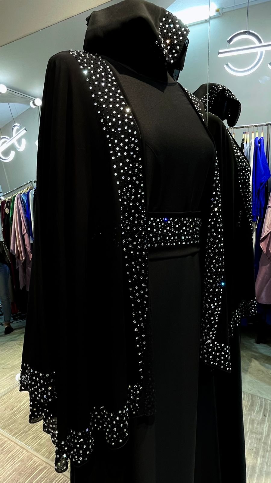 An abaya with sparkling stones .Stunning cape farasha-style abaya featuring a flowy, butterfly-inspired design, combining effortless elegance with modern flair for any occasion.