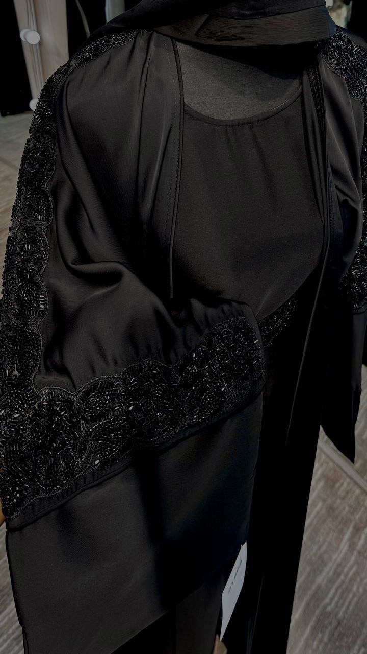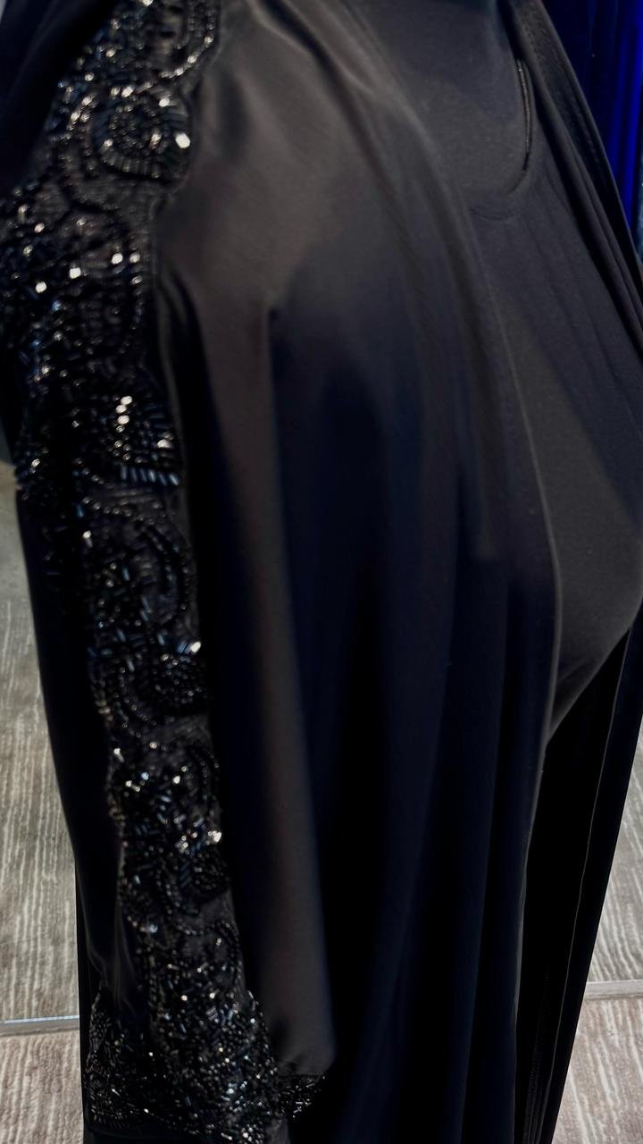 This luxurious Abaya Dress is made of Silky Zoom and Nida inner, which is smooth and pleasant to skin and decorated with beads and comes with a Matching Hijab.