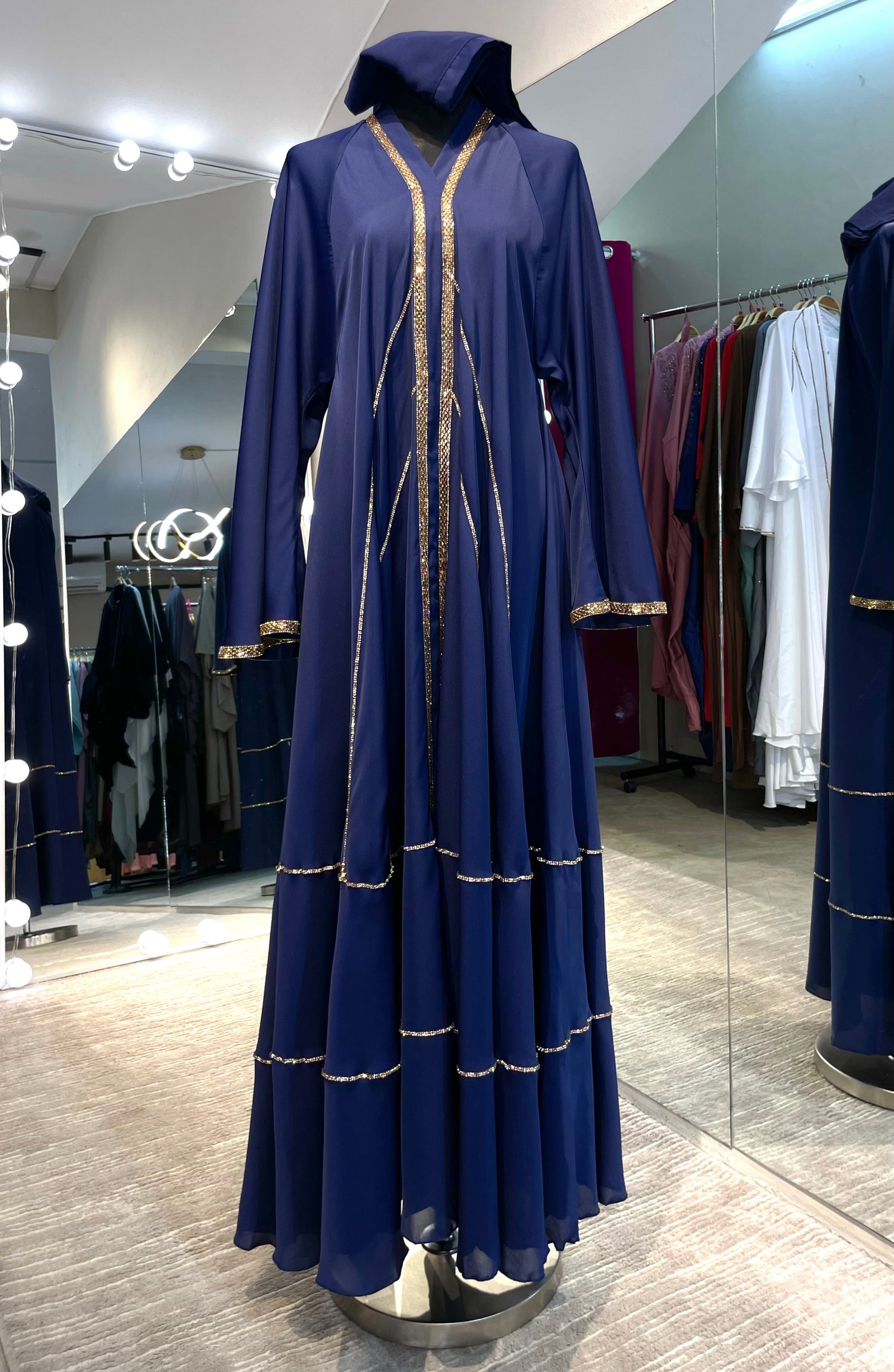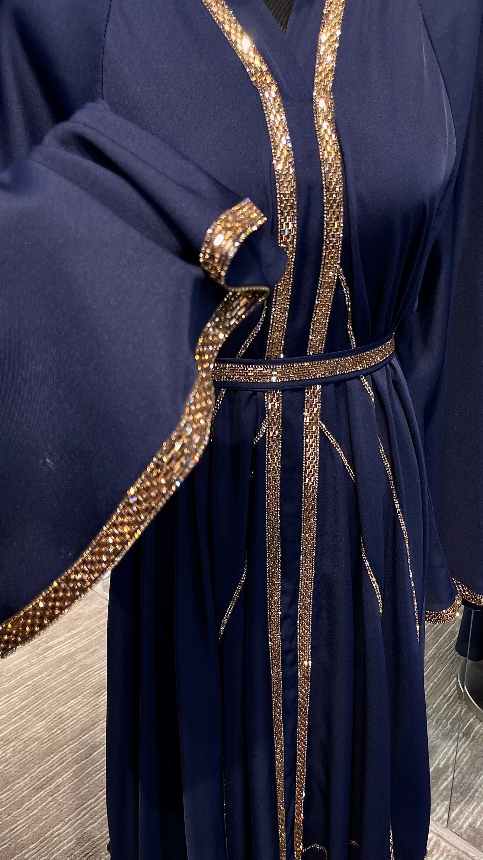 Timeless elegance with this umbrella-cut abaya, crafted from premium Nida fabric for a soft, lightweight feel. The graceful flared design is complemented by delicate gold stone lining, adding a luxurious touch perfect for special occasions.